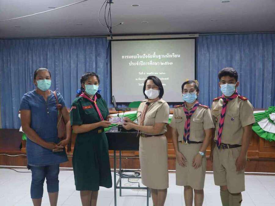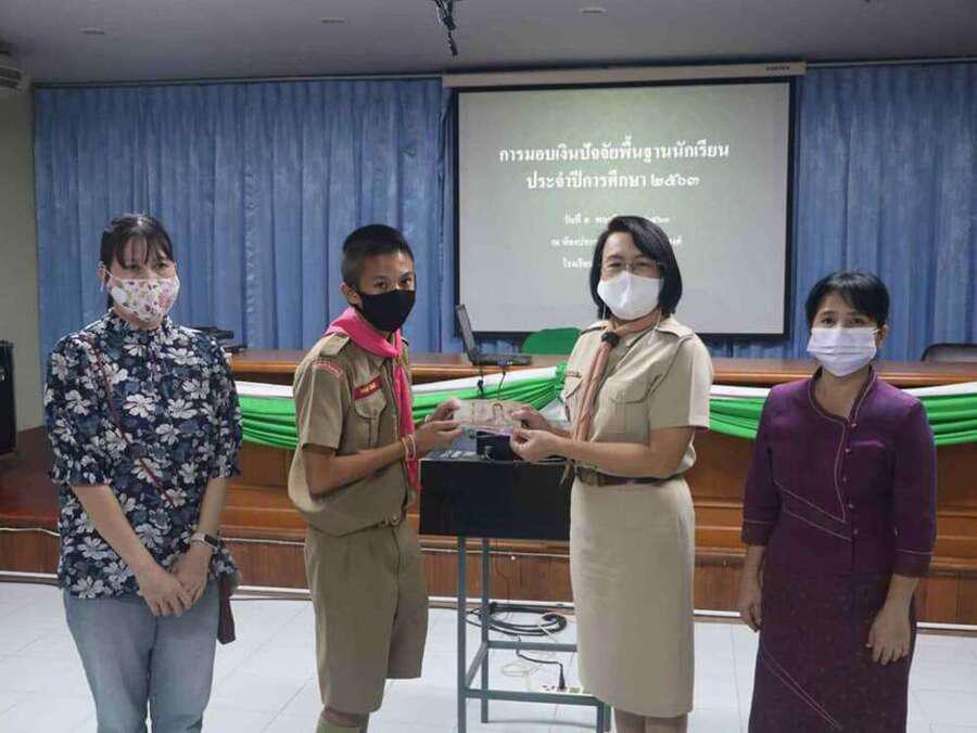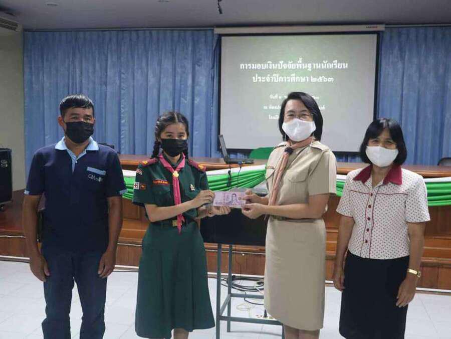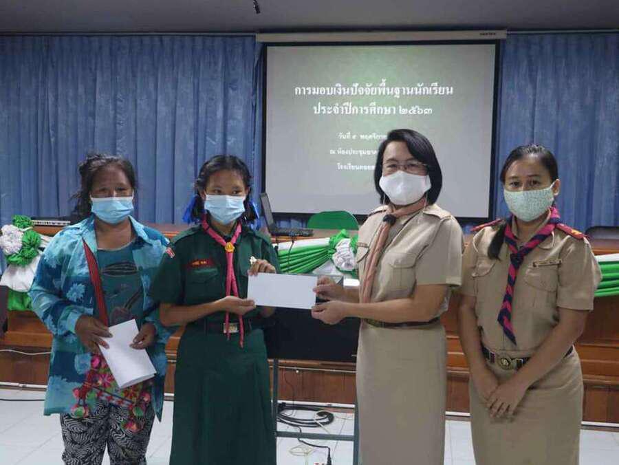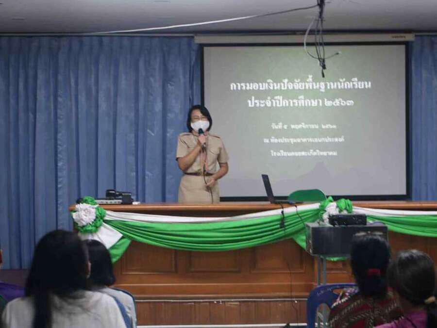 นางดวงใจ ญาณโรจน์ ให้เกียรติมอบทุนปัจจัยพื้นฐานนักเรียน ณ อาคารเอนกประสงค์ โรงเรียนดอยสะเก็ดวิทยาคม