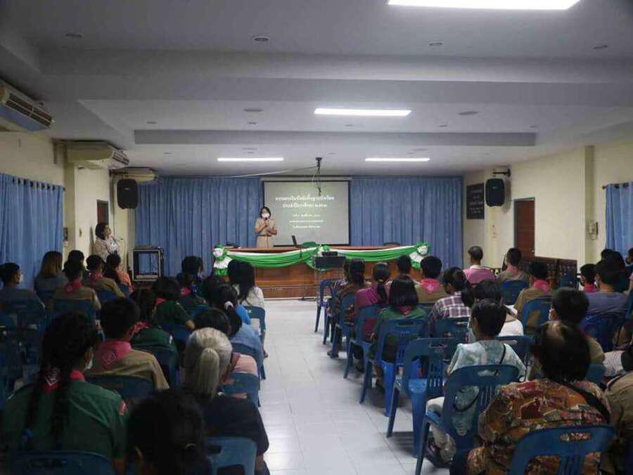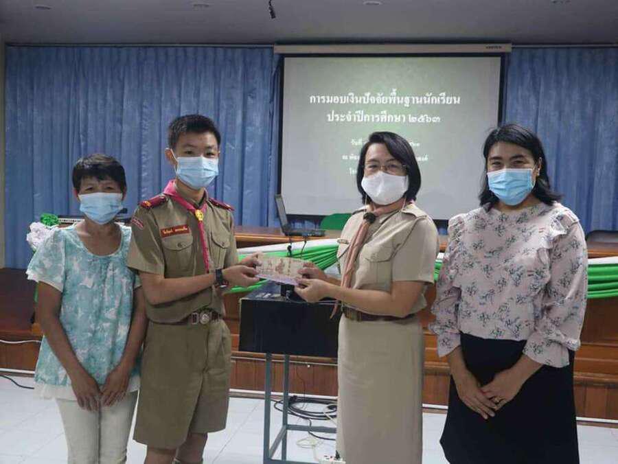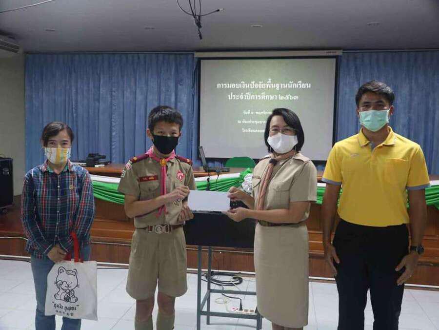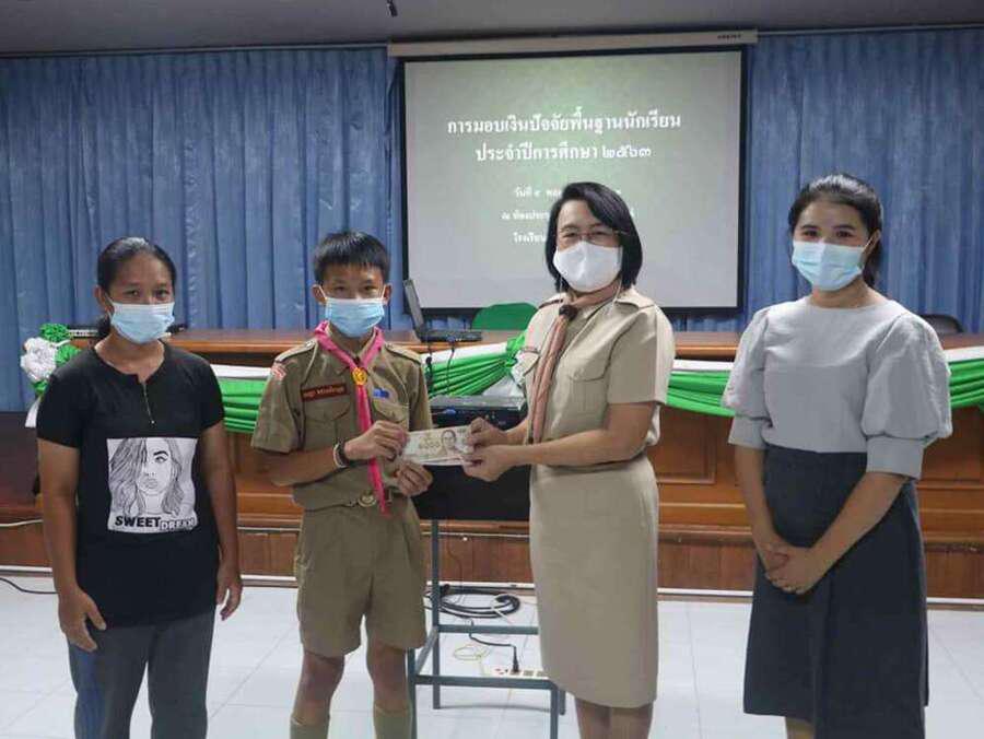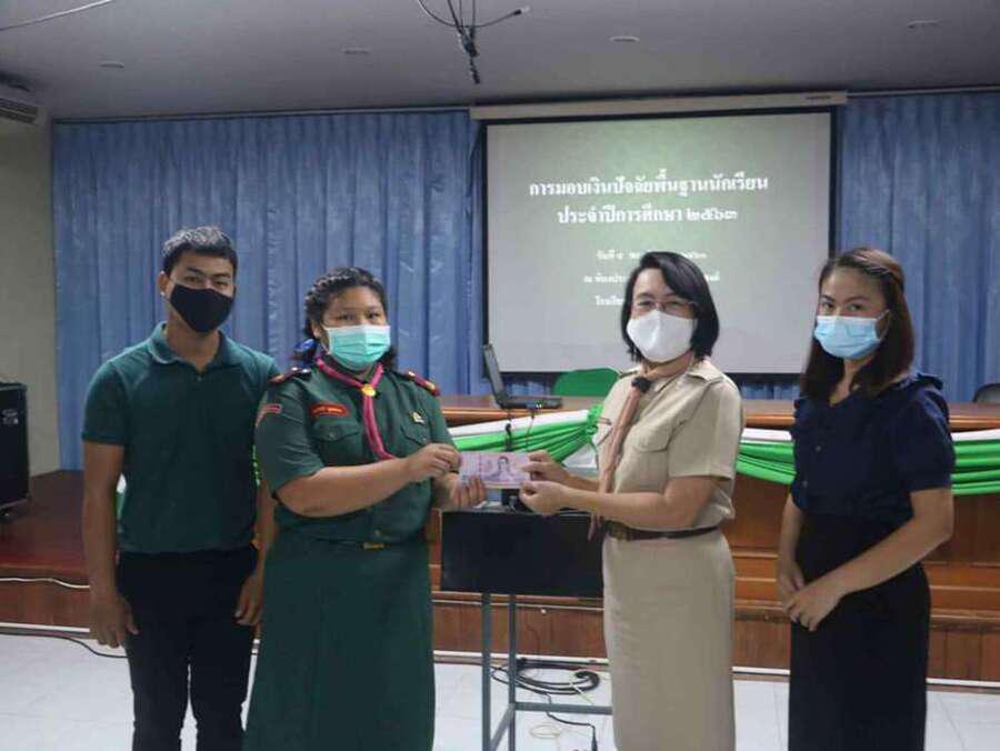 นางดวงใจ ญาณโรจน์ ให้เกียรติมอบทุนปัจจัยพื้นฐานนักเรียน ณ อาคารเอนกประสงค์ โรงเรียนดอยสะเก็ดวิทยาคม