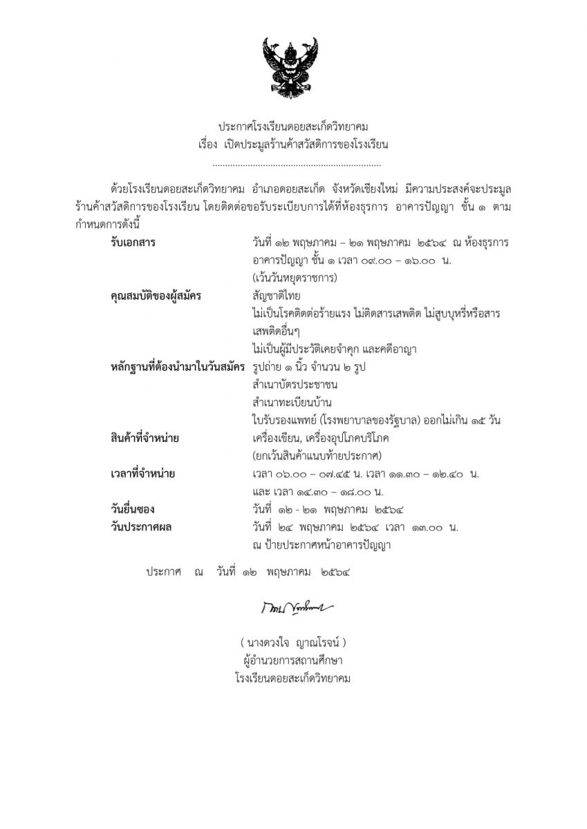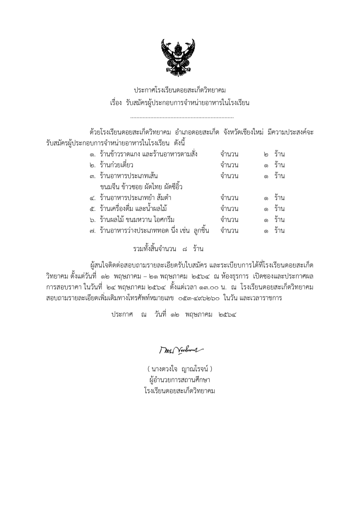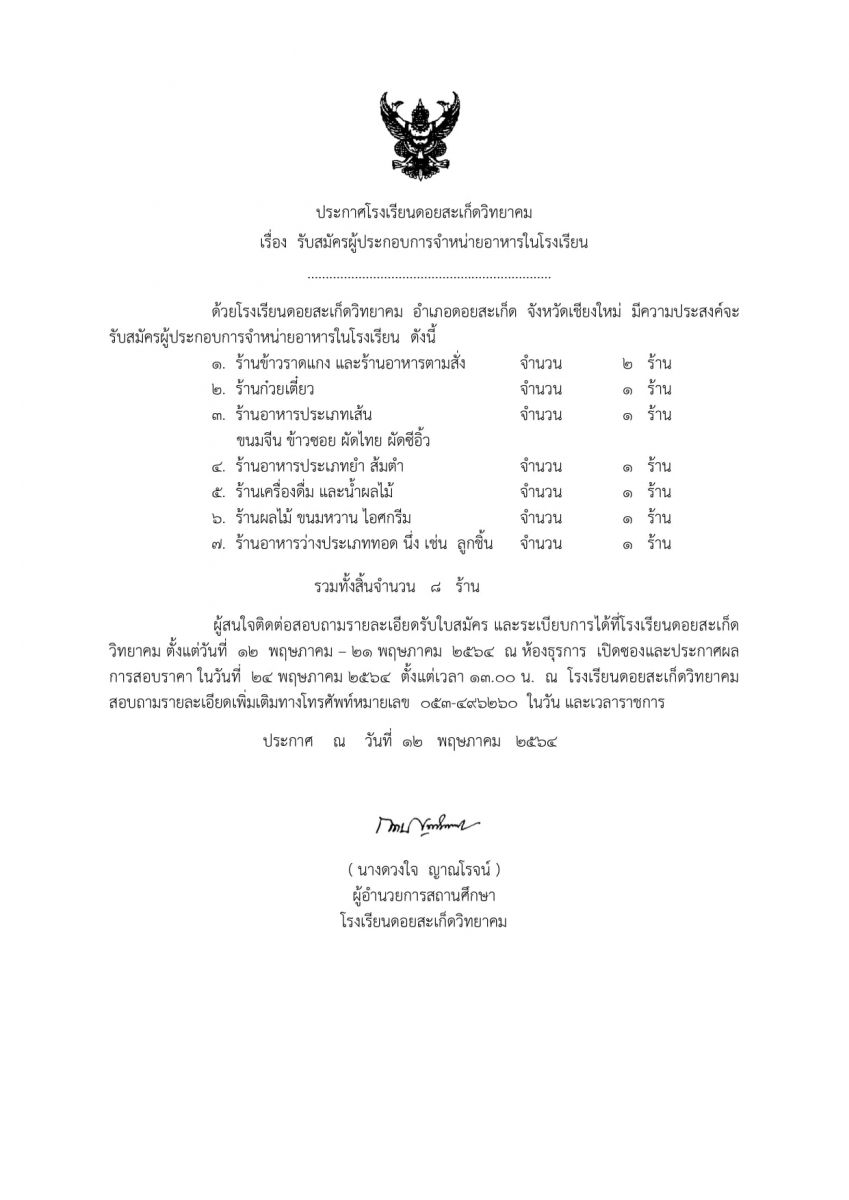 โรงเรียนดอยสะเก็ดวิทยาคม มีความประสงค์รับสมัครผู้ประกอบการจำหน่ายอาหารในโรงเรียน และมีความประสงค์จะประมูลร้านค้าสวัสดิการโรงเรียน