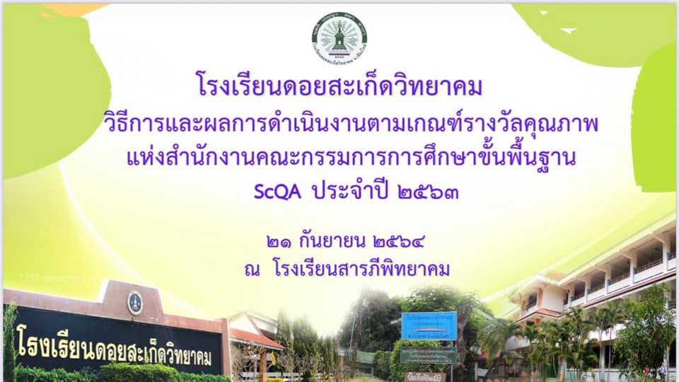 วันที่ 21 กันยายน 2564 โรงเรียนดอยสะเก็ดวิทยาคม นำโดย ท่านรองผอ. ปัทมาวดี อุดแดง และตัวแทนคณะครู คุณครูพรพิมล บุญโคตร คุณครูพรพิมล พวงย้อยแก้ว และคุณครูชนกนาถ เขียวตา นำเสนอและประชุมการบริหารการจัดการด้วยระบบคุณภาพ ScQA ปี 2564 ณ โรงเรียนสารภีพิทยาคม