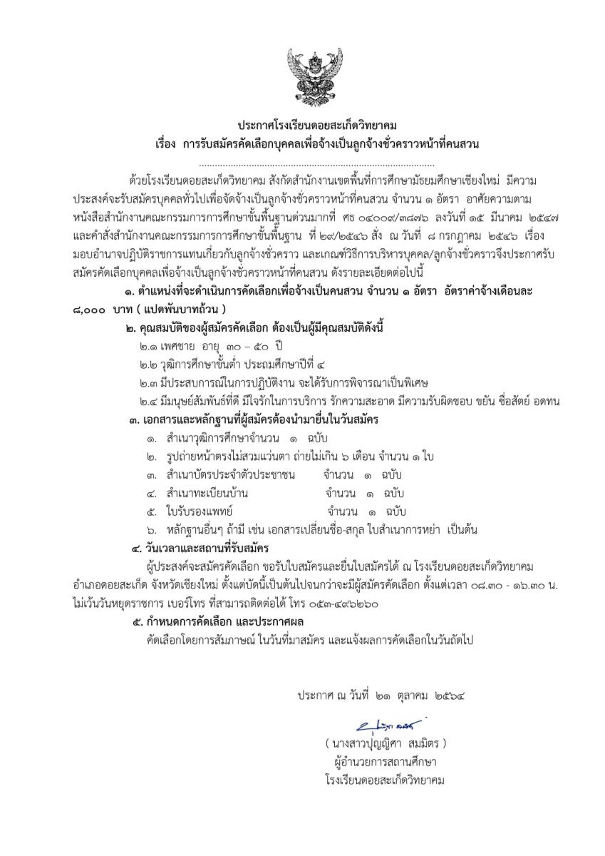 ด้วย รร.ดอยสะเก็ดวิทยาคม มีความประสงค์รับสมัครบุคคลทั่วไปเพื่อจ้างเป็นลูกจ้างชั่วคราวทำหน้าที่คนสวน จำนวน 1 อัตรา ตั้งแต่บัดนี้เป็นต้นไป จนกว่าจะมีผู้สมัครคัดเลือก ตั้งแต่เวลา 08.30 - 16.30 น. ไม่เว้นวันหยุดราชการ (รายละเอียดการรับสมัครตามแนบประกาศ)