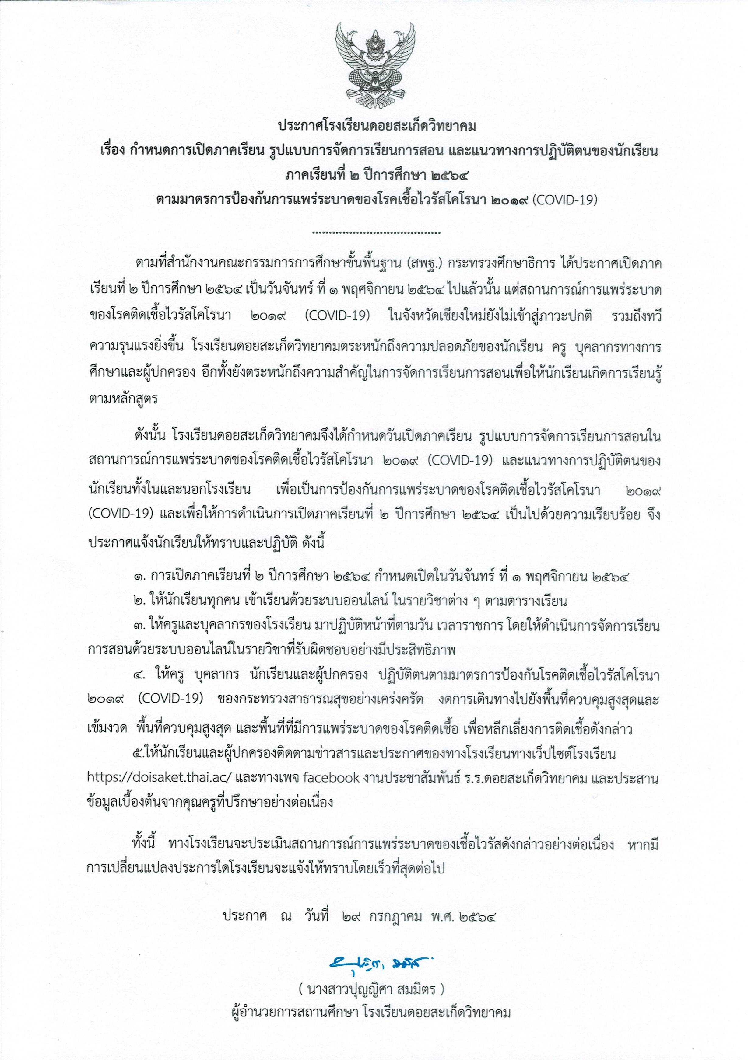 กำหนดการเปิดภาคเรียน รูปแบบการจัดการเรียนการสอน และแนวทางการปฏิบัติของนักเรียน ภาคเรียนที่ ๒ ปีการศึกษา ๒๕๖๔