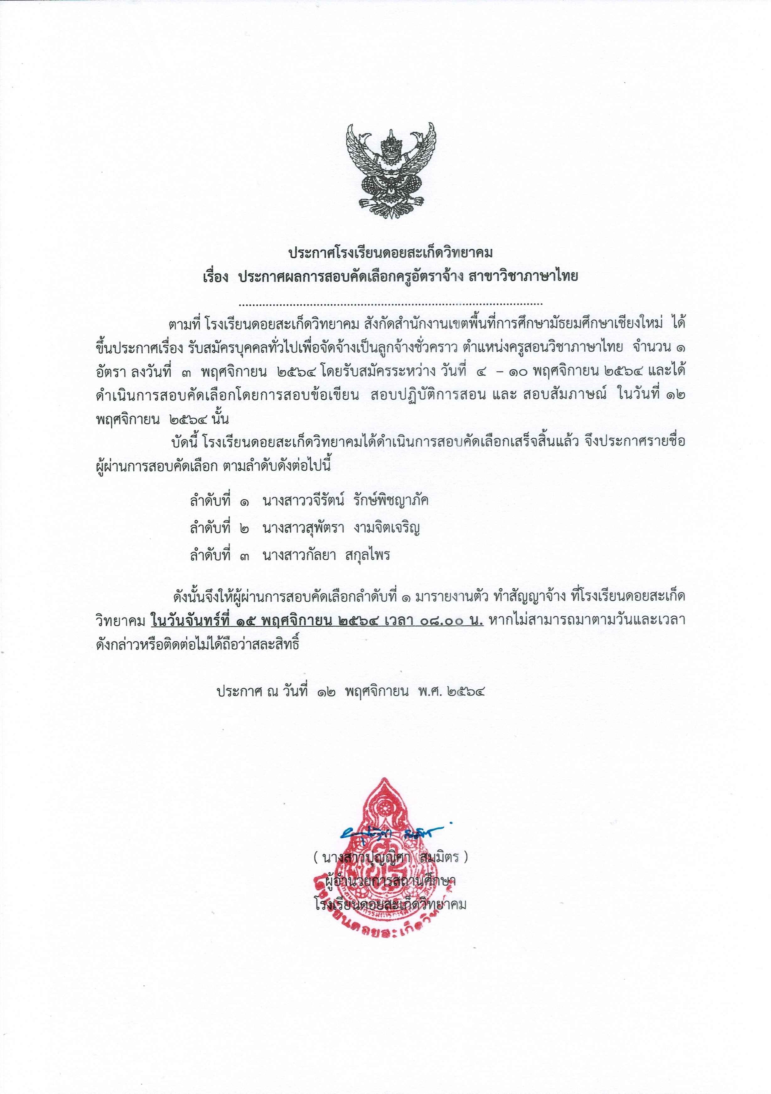 ประกาศผลการสอบคัดเลือกครูอัตราจ้าง สาขาวิชาภาษาไทย