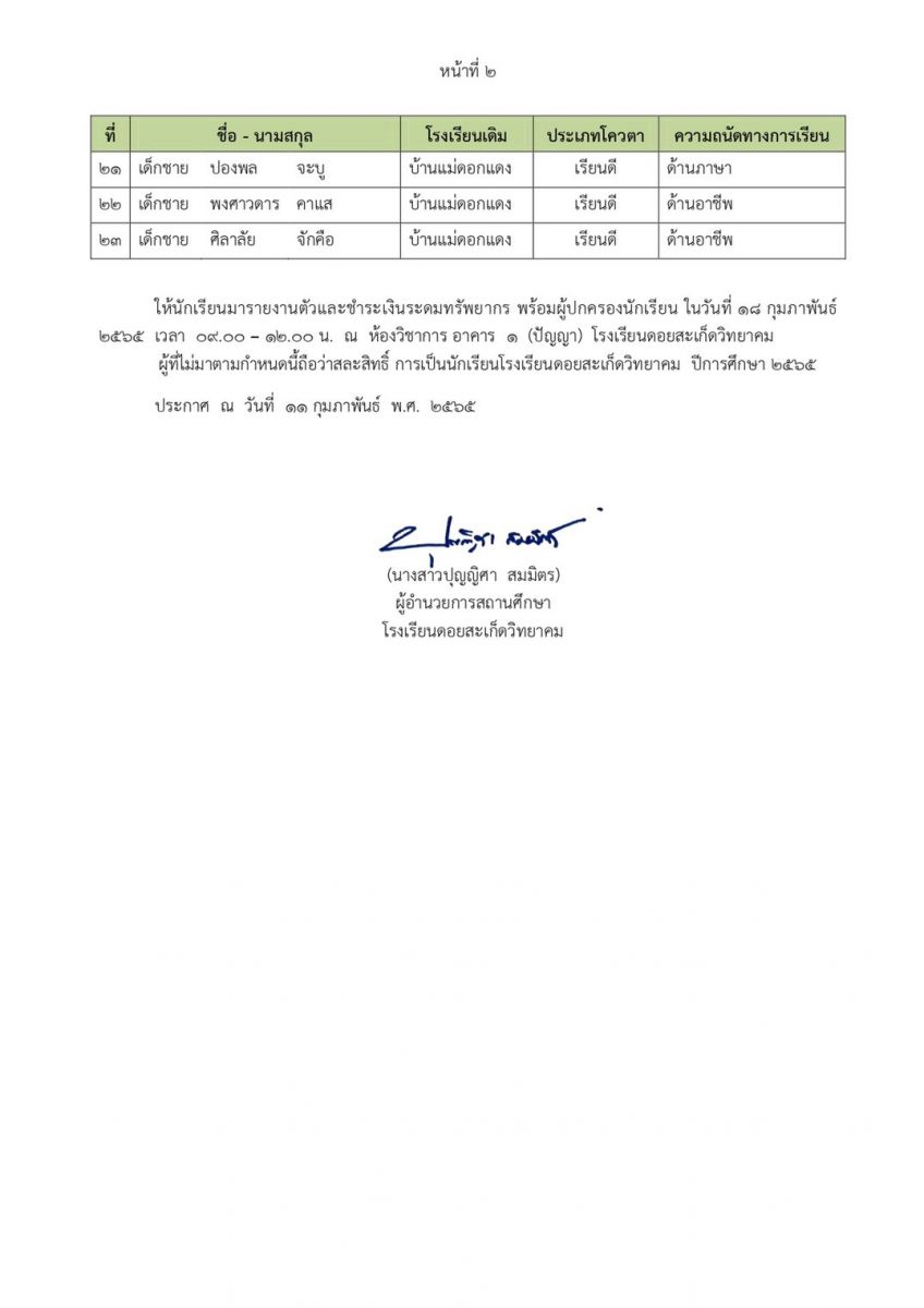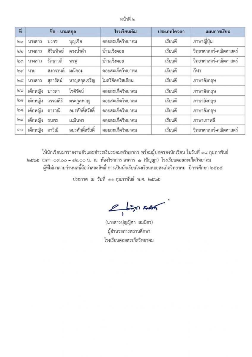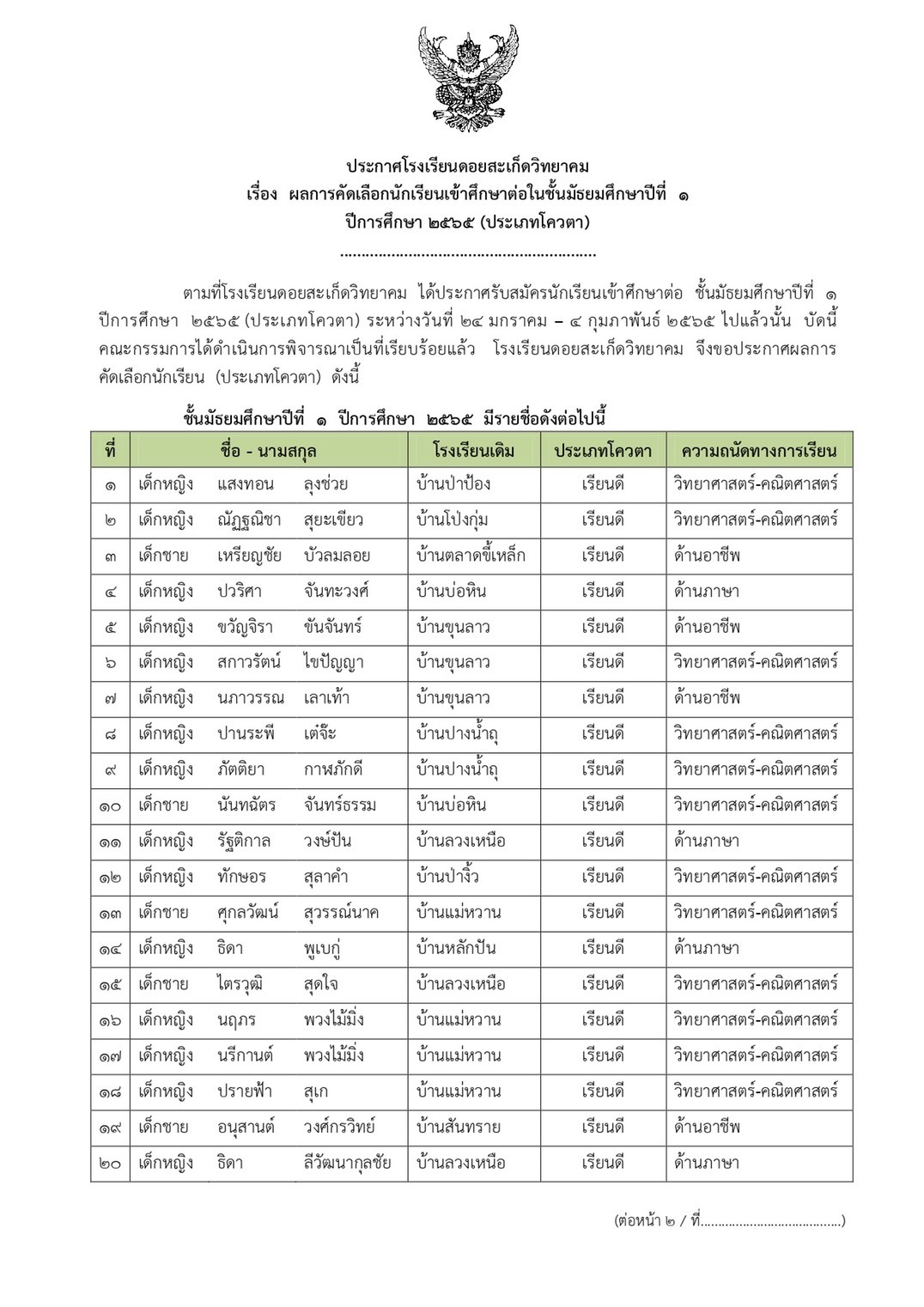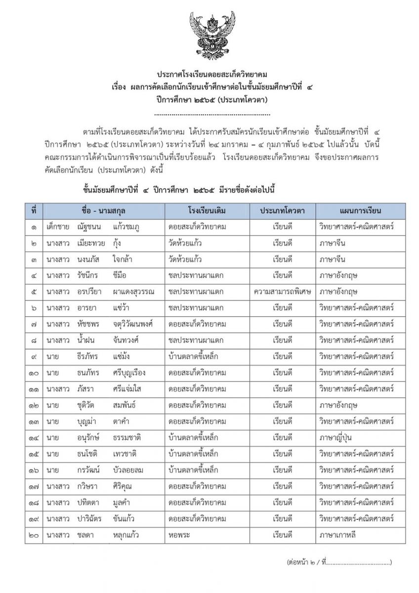 ประกาศผลการคัดเลือกนักเรียนเข้าศึกษาต่อในชั้นมัธยมศึกษาปีที่ ๑ และ มัธยมศึกษาปีที่ ๔ ปีการศึกษา ๒๕๖๕ (ประเภทโควตา)