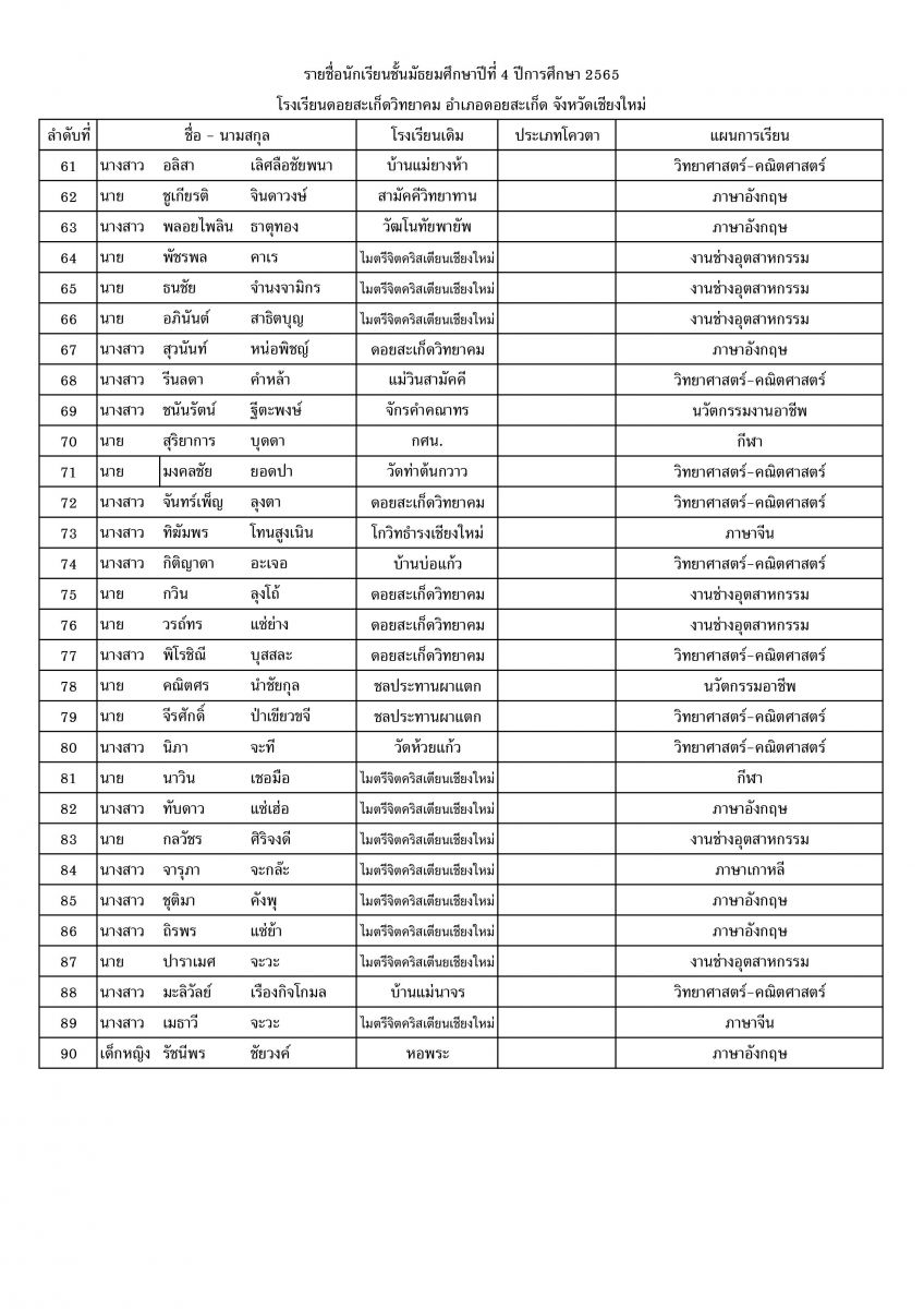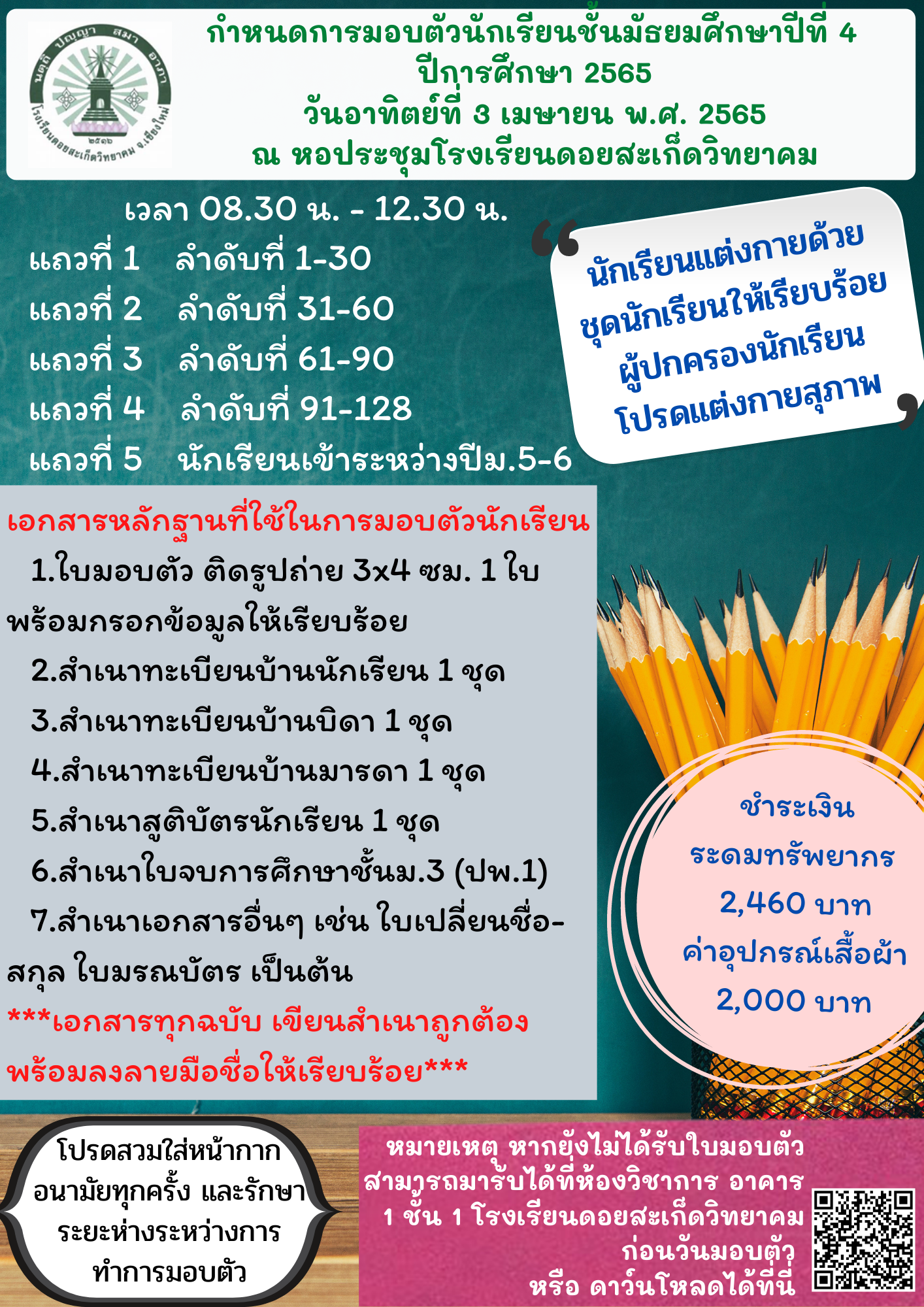 กำหนดการมอบตัวนักเรียนชั้นมัธยมศึกษาปีที่ 4 ปีการศึกษา 2565 วันอาทิตย์ที่ 3 เมษายน พ.ศ. 2565 ณ หอประชุมโรงเรียนดอยสะเก็ดวิทยาคม