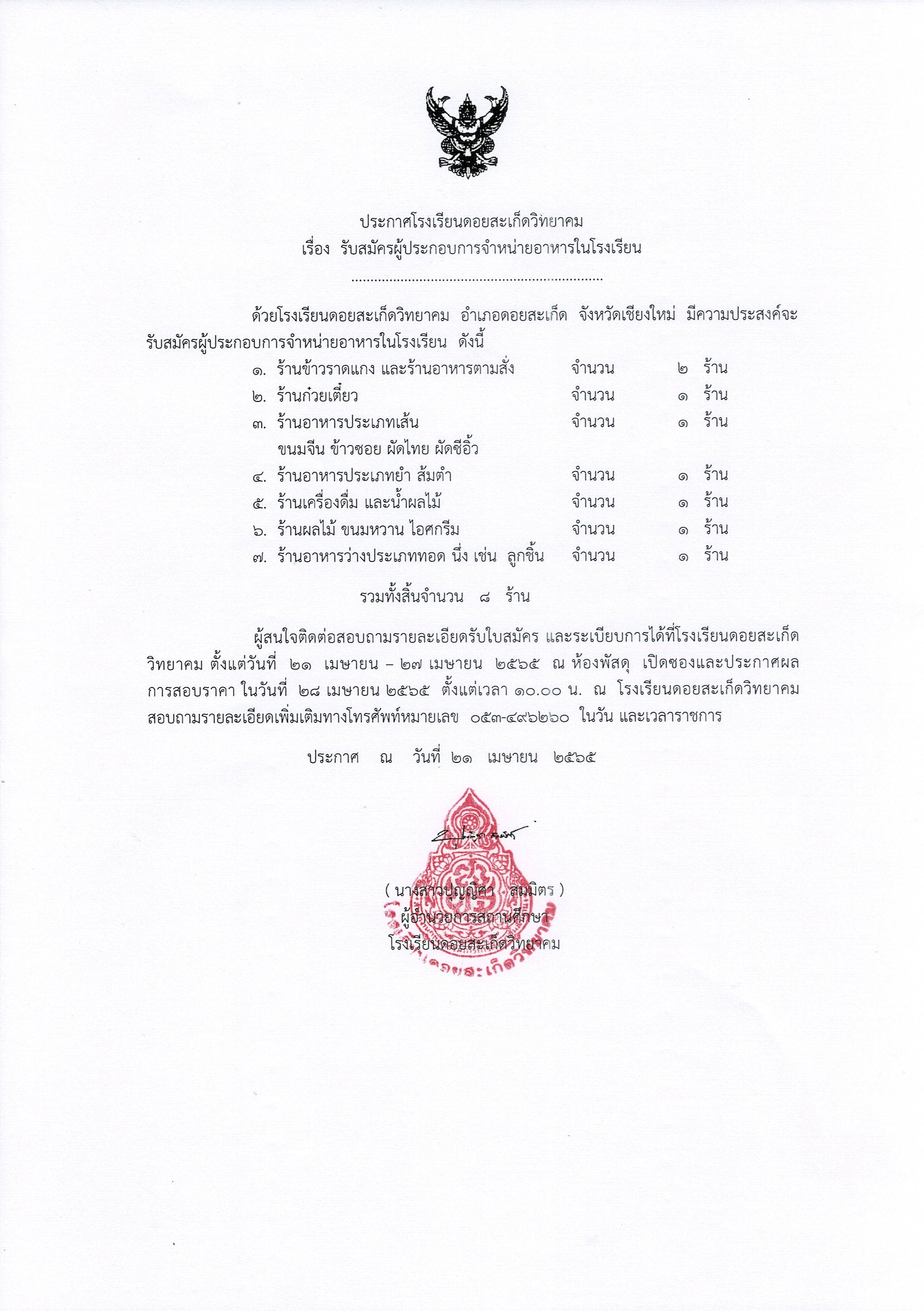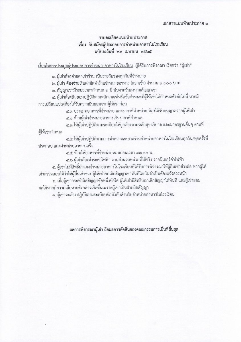ประกาศรับสมัครผู้ประกอบการจำหน่ายอาหารในโรงเรียน