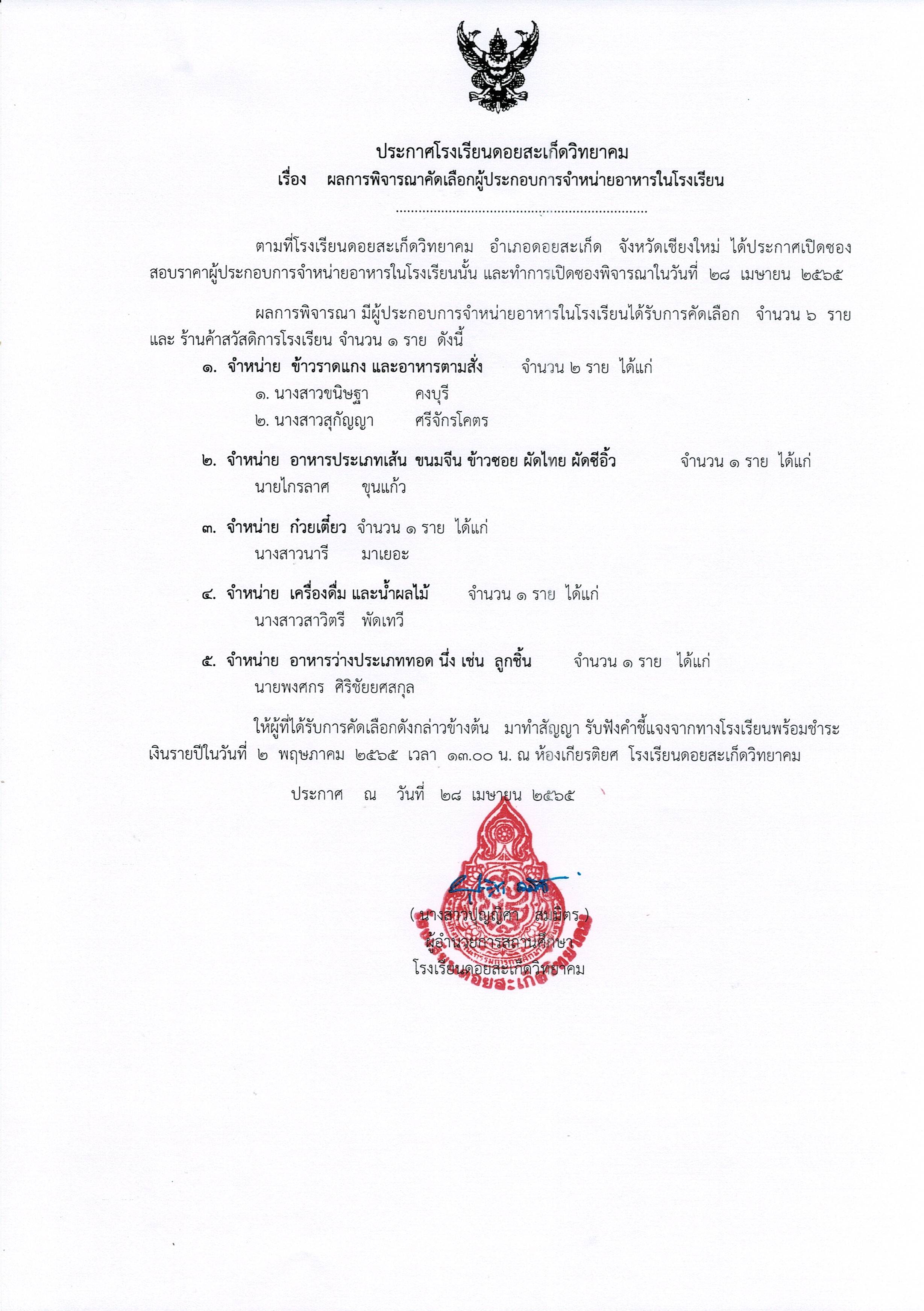 ผลการพิจารณาคัดเลือกผู้ประกอบการจำหน่ายอาหารในโรงเรียน