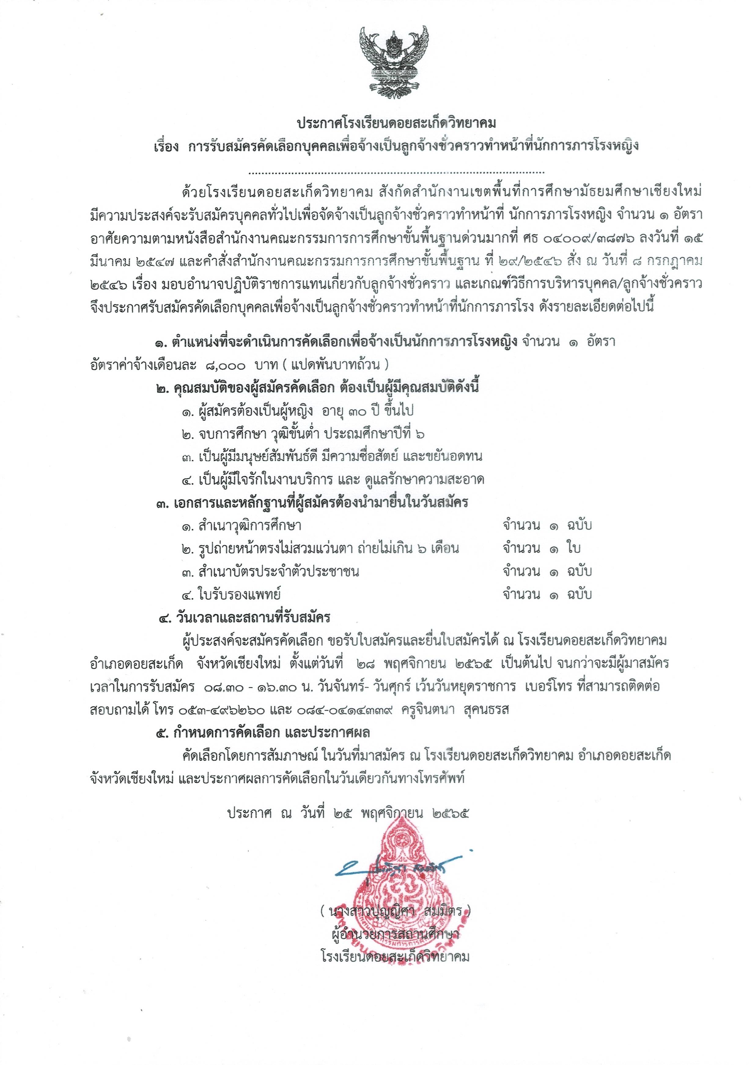 รับสมัครคัดเลือกบุคคลเพื่อจ้างเป็นลูกจ้างชั่วคราวทำหน้าที่นักการภารโรงหญิง