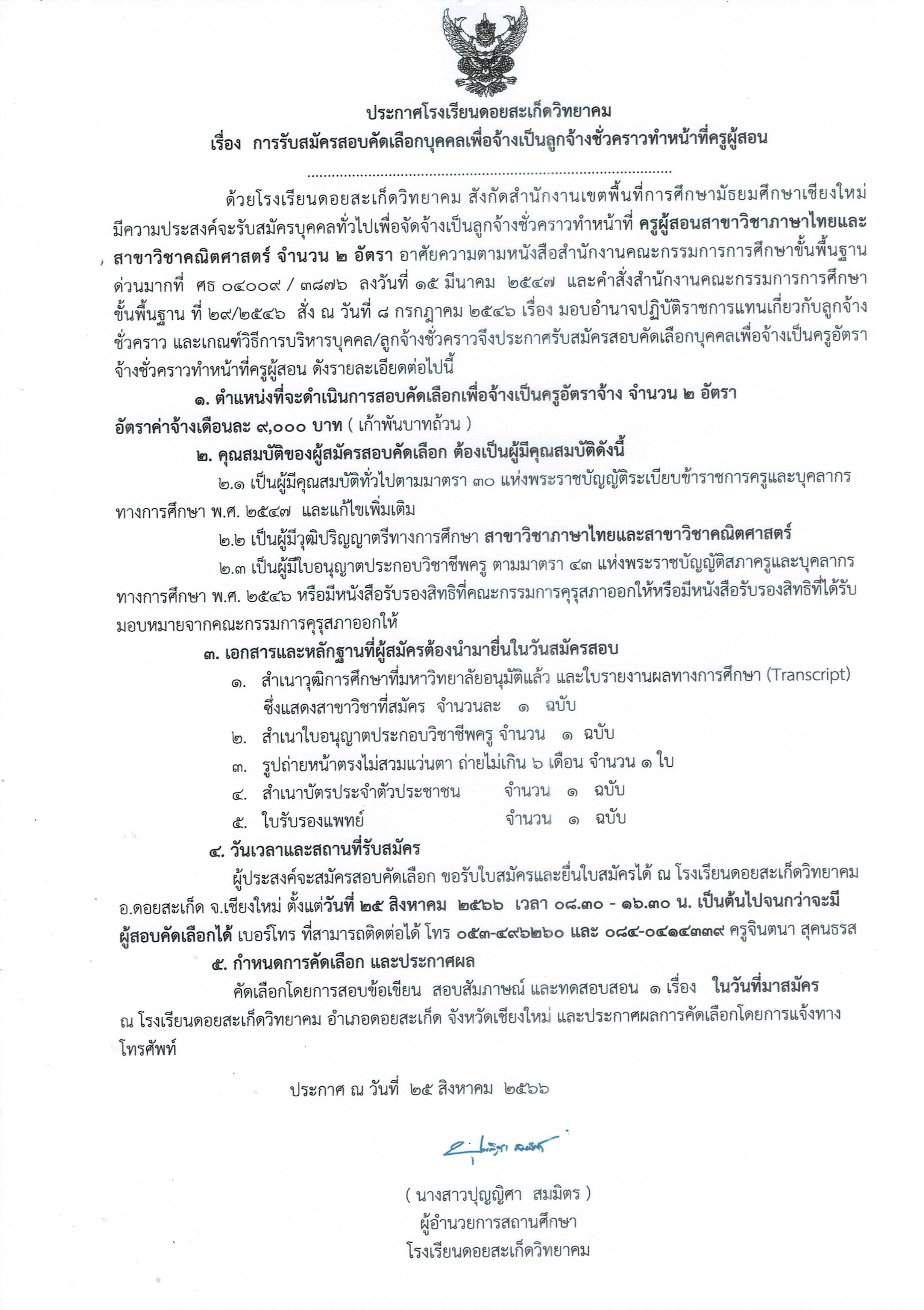 การรับสมัครสอบคัดเลือกบุคคลเพื่อจ้างเป็นลูกจ้างชั่วคราวทำหน้าที่ครูผู้สอนสาขาวิชาภาษาไทย และ สาขาวิชาคณิตศาสตร์