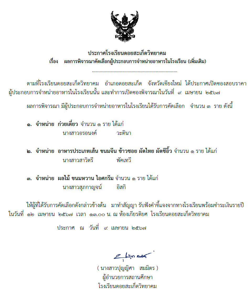ผลการพิจารณาคัดเลือกผู้ประกอบการจำหน่ายอาหารในโรงเรียน (เพิ่มเติม)