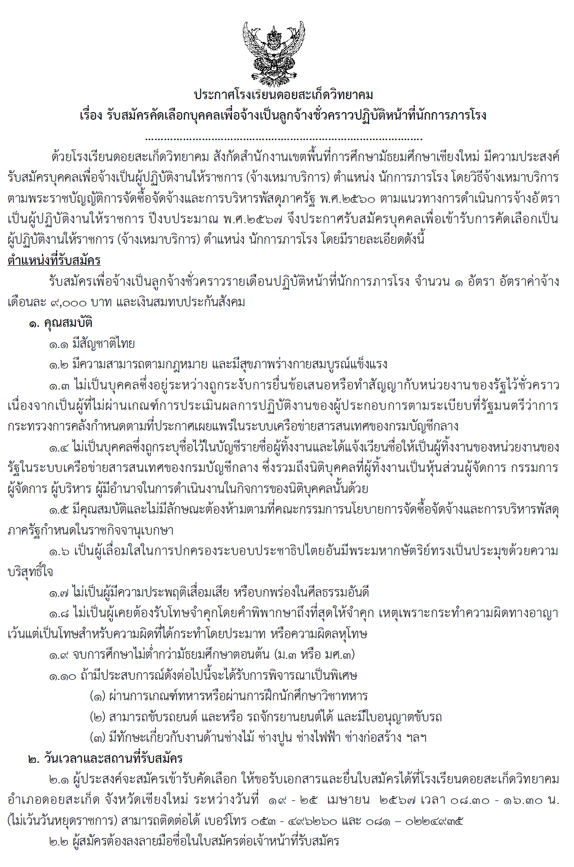 รับสมัครคัดเลือกบุคคลเพื่อจ้างเป็นลูกจ้างชั่วคราวปฏิบัติหน้าที่นักการภารโรง
