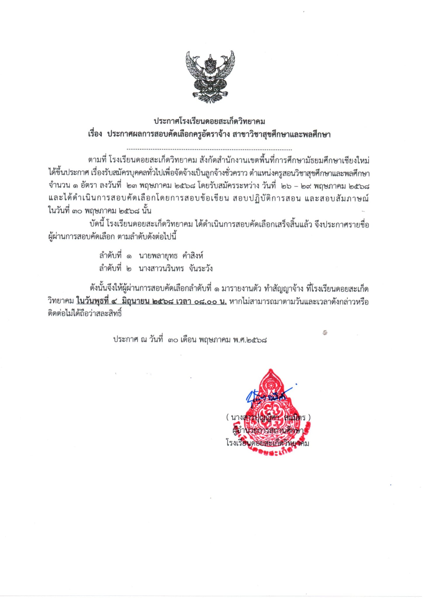 ประกาศผลการสอบคัดเลือกครูอัตราจ้าง สาขาวิชาสุขศึกษาและพลศึกษา