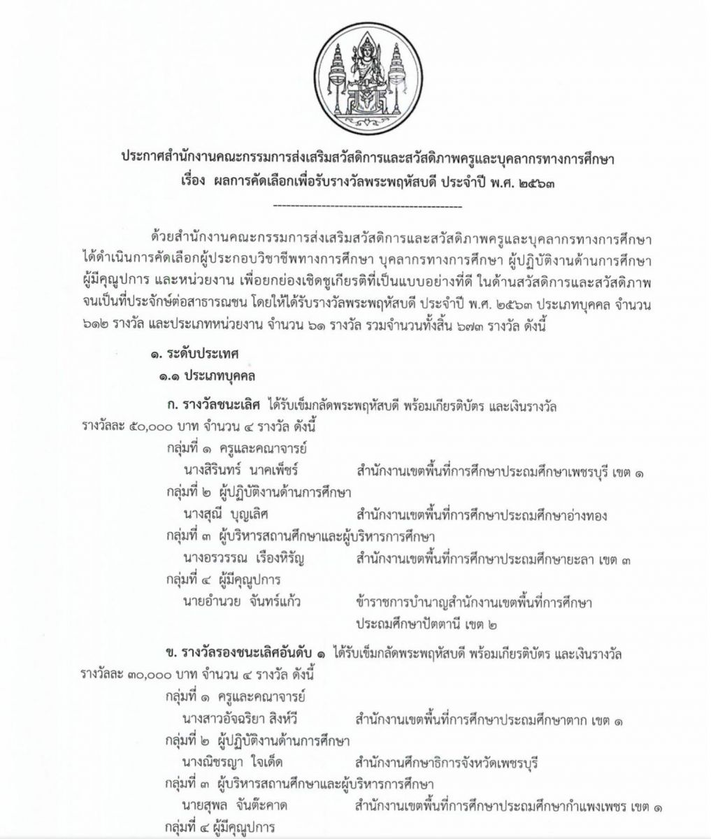 - รางวัลพระพฤหัสบดี ประจำปี พ.ศ. ๒๕๖๓ จากสำนักงานคณะกรรมการส่งเสริมสวัสดิการและสวัสดิภาพครูและบุคลากรทางการศึกษา