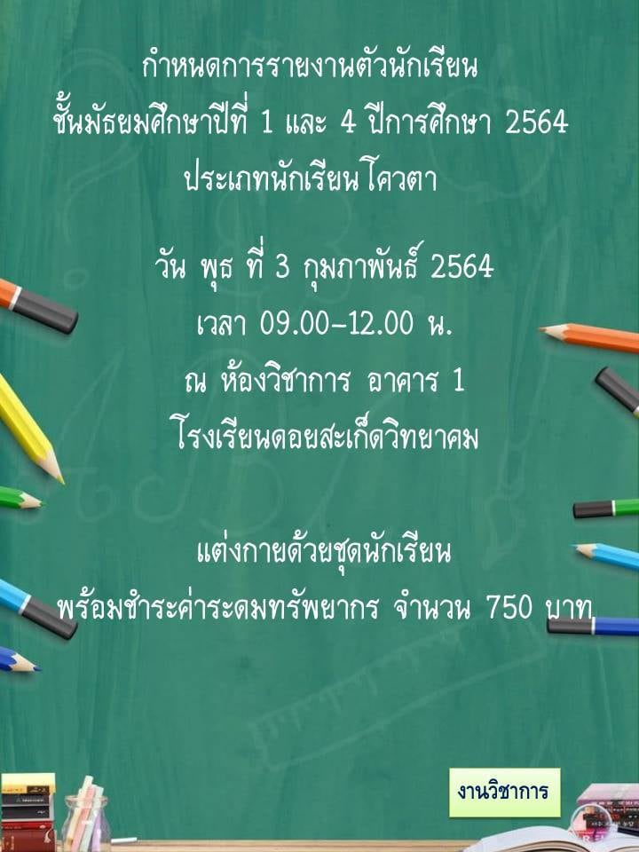 นักเรียนที่มีรายชื่อ ให้มารายงานตัว ในวัน พุธ ที่ 3 กุมภาพันธ์ 2564 ตั้งแต่เวลา 09.00 น. - 12.00 น. ณ ห้องวิชาการ อาคาร 1 โรงเรียนดอยสะเก็ดวิทยาคมค่ะ ปล. แต่งกายด้วยชุดนักเรียน และอย่าลืมสวมหน้ากากอนามัยด้วยนะคะ