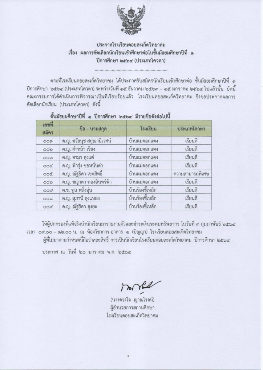 โรงเรียนดอยสะเก็ดวิทยาคม ประกาศผลการคัดเลือกนักเรียนเข้าศึกษาต่อระดับชั้นมัธยมศึกษาปีที่1 และมัธยมศึกษาปีที่4 ประเภทโควตา